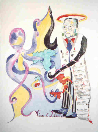 Deshalb malte ich ihn umringt von Mikrofonen deren Kabel im Nirgendwo verlaufen, denn keine hört mehr zu. Er selber steht auf der Insel seiner eigenen Worte – bla – bla –bla …...die im Sande verrinnen.